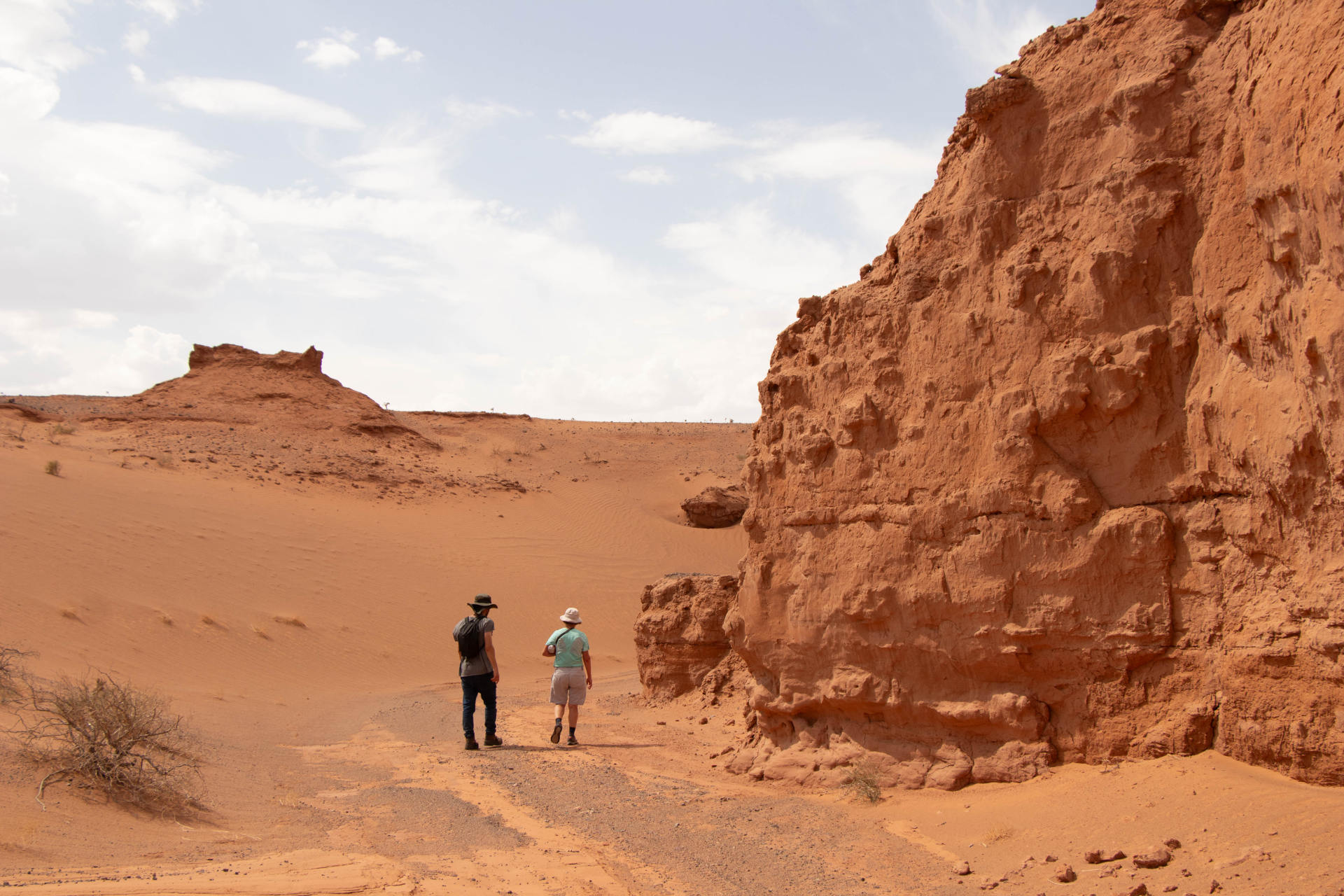 (En option, une balade à dos de chameau) vous permet d’explorer les dunes en douceur, ou une ascension tranquille au moment idéal de la journée pour admirer les variations de lumière et les couleurs spectaculaires du désert.Petit déjeuner, déjeuner, diner Camp touristique Luxe (DREAM GOBI LODGE)Environ 3-4 heures (180 km)Cette journée est consacrée à la découverte de Bayanzag, surnommée les Falaises enflammées, l’un des sites les plus emblématiques du désert de Gobi. Ces formations rocheuses rouges, sculptées par le temps, semblent s’embraser sous les rayons du soleil couchant, offrant un spectacle naturel d’une intensité rare.