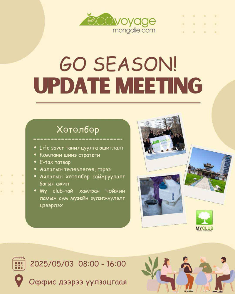 Le 3 mai 2025, Eco Voyage en Mongolie (Avid Zam LLC) a marqué le coup d’envoi de la nouvelle saison touristique par un événement d’ouverture riche en échanges, en apprentissages et en énergie positive.