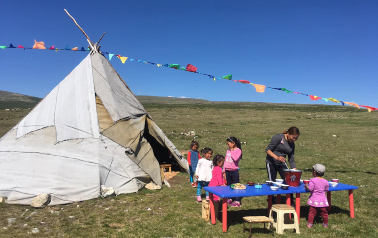 L’école maternelle chez les Tsaatans au nord de Mongolie. C’est auprès d’une famille d’éleveurs de rennes de l’ethnie des Tsaatan que se terminera cette riche journée hivernale. L’élevage de ce cervidé est propre à cette région de Mongolie où relief, la végétation et climat diffèrent du reste du pays.